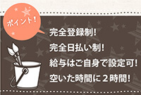 | 勤務日: | 完全登録制・月1日・週1日からでもOK!空いた曜日でお仕事が可能 |